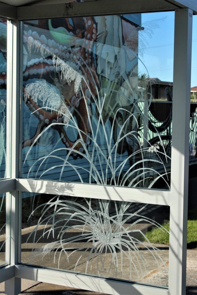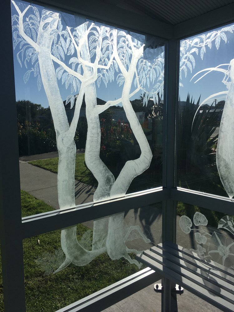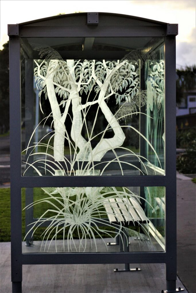 Commissioned as a joint project by Whanganui District Council and Horizons Regional Council, the new bus shelter on the corner of Rangiora and Karaka Street in Castlecliff, Whanganui has been months in the making. Using a bus shelter as a canvas for art bids to create a more beautiful environment for locals and visitors alike, moving art out of the gallery and into the community in a practical and magical way.